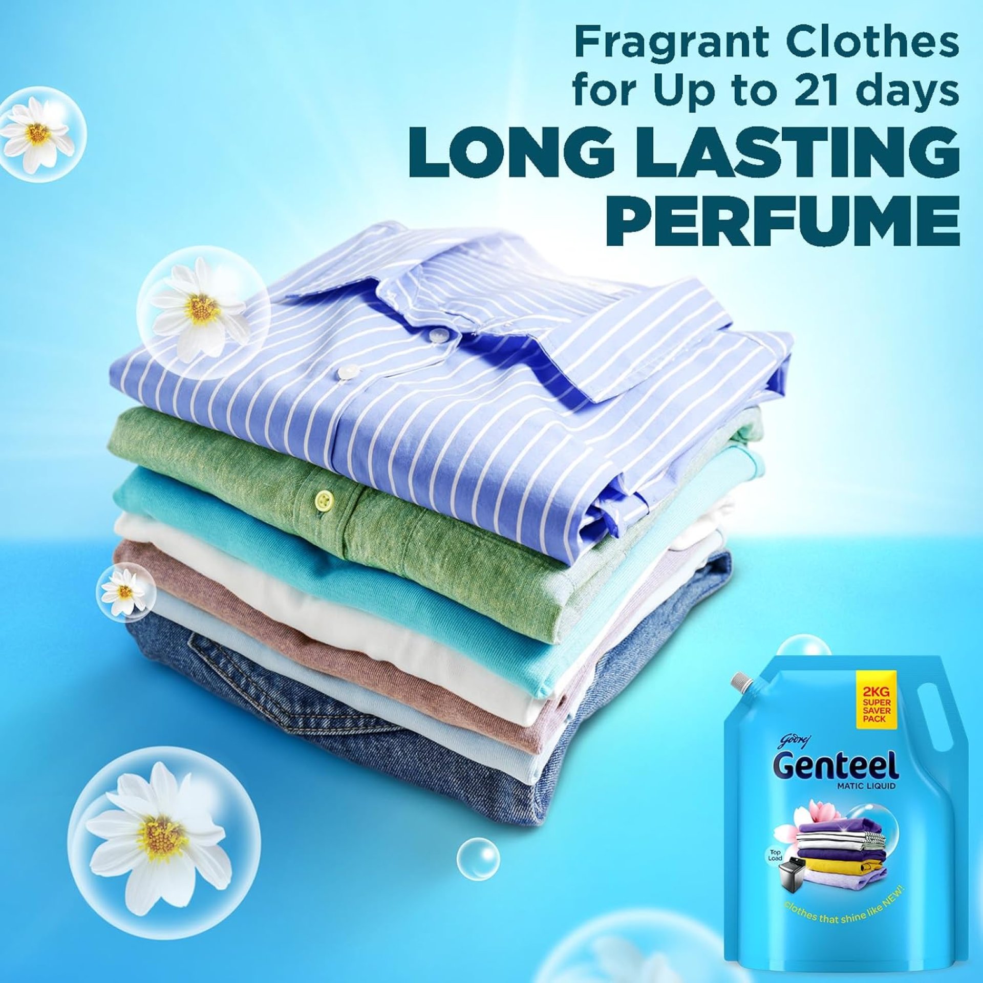 Genteel matic detergent liquid for washing machine is an all-purpose laundry detergent from the house of Godrej. It is the best solution for your everyday clothes. The special strong formula of Genteel washing machine liquid delivers absolute cleansing for whites as well as your coloured clothes. Genteel has an added fabric conditioner that softens the fabric and leaves your clothes with a lingering fragrance. This liquid detergent for Top load washing machine has a functionally superior design that is easy to handle. This liquid detergent for top load washing machine also has a measuring cap which makes it easier not just to measure the right amount of liquid detergent but to pour as well. The pH-neutral no-soda formula prevents your clothes from shrinking and fading. This top load washing machine liquid is ideal for all those clothes that need a little extra care because it's safe and gentle on your expensive lingerie, shawls, silks, woolens and even babywear.